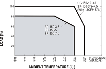 Ex. SP-150產(chǎn)品減額曲線,一般橫置/立式的應(yīng)用環(huán)境溫度差5°C,而有強(qiáng)制散熱/自然散熱差20%輸出功率。